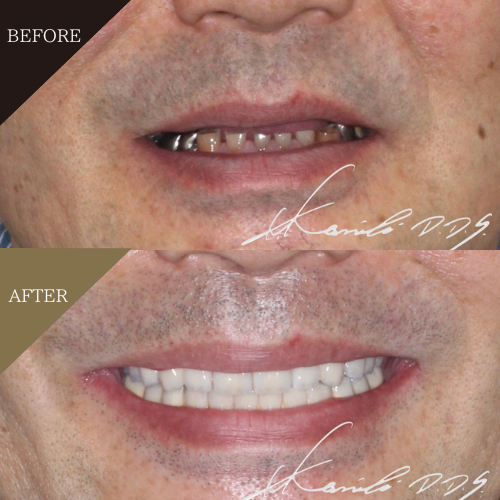上下ともコーヌステレスコープで治療。コーヌステレスコープは歯の上に被せる入れ歯なので、歯の変色や歯の形、大きさも変えることができます。噛めるようになるのはもちろん、口元がキレイになり歯を見せて笑えるようになりました。