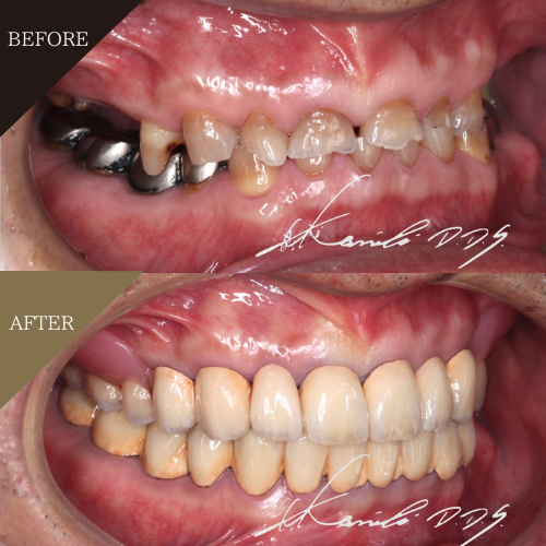 | 上あご下あご共にコーヌステレスコープで治療。同時に歯周病治療、根管治療、虫歯治療、噛み合わせ治療を実施。 |