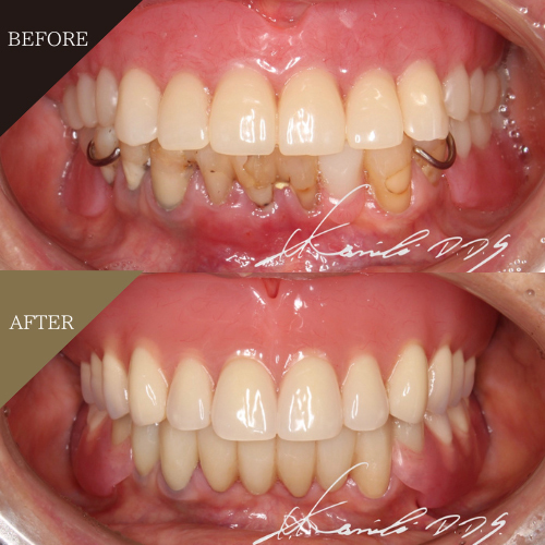 | 上あごをレジリエンツテレスコープ、下あごはセラミッククラウンとノンクラスプデンチャーにて治療。同時に歯周病治療、根管治療、虫歯治療、噛み合わせ治療を実施。 |