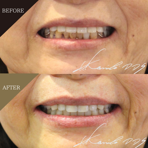 歯を1本でも多く残したいとのことで、上あごは歯を守れるレジリエンツテレスコープで治療。1本の歯を残すことができました。下あごは変色部分をセラミックで被せ、金具がない入れ歯にし、見た目がきれいになりました。